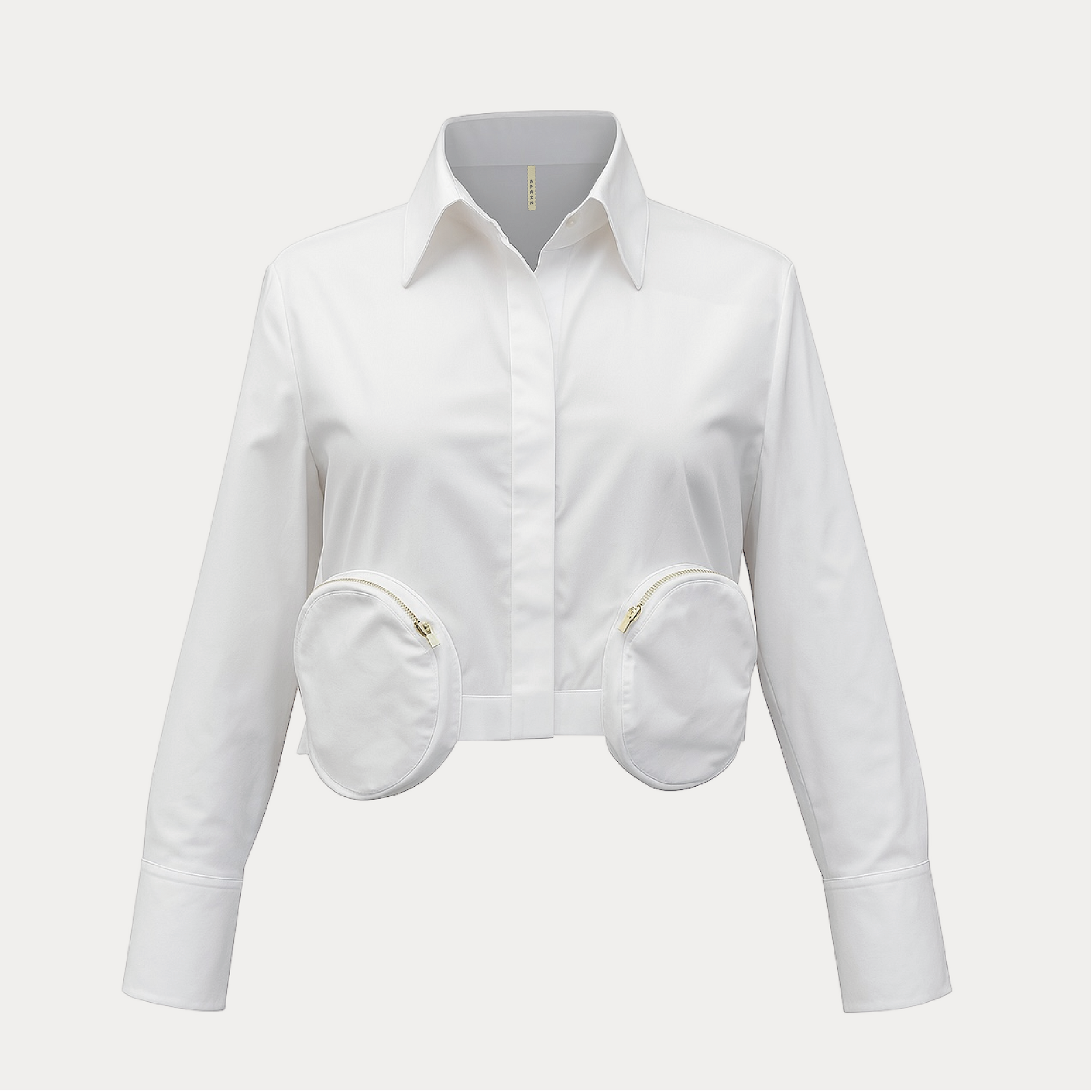 Diseñada para quien no teme destacar. Esta camisa corta en popelina redefine lo clásico con un giro inesperado: dos bolsillos redondos con cremallera que se roban todas las miradas.