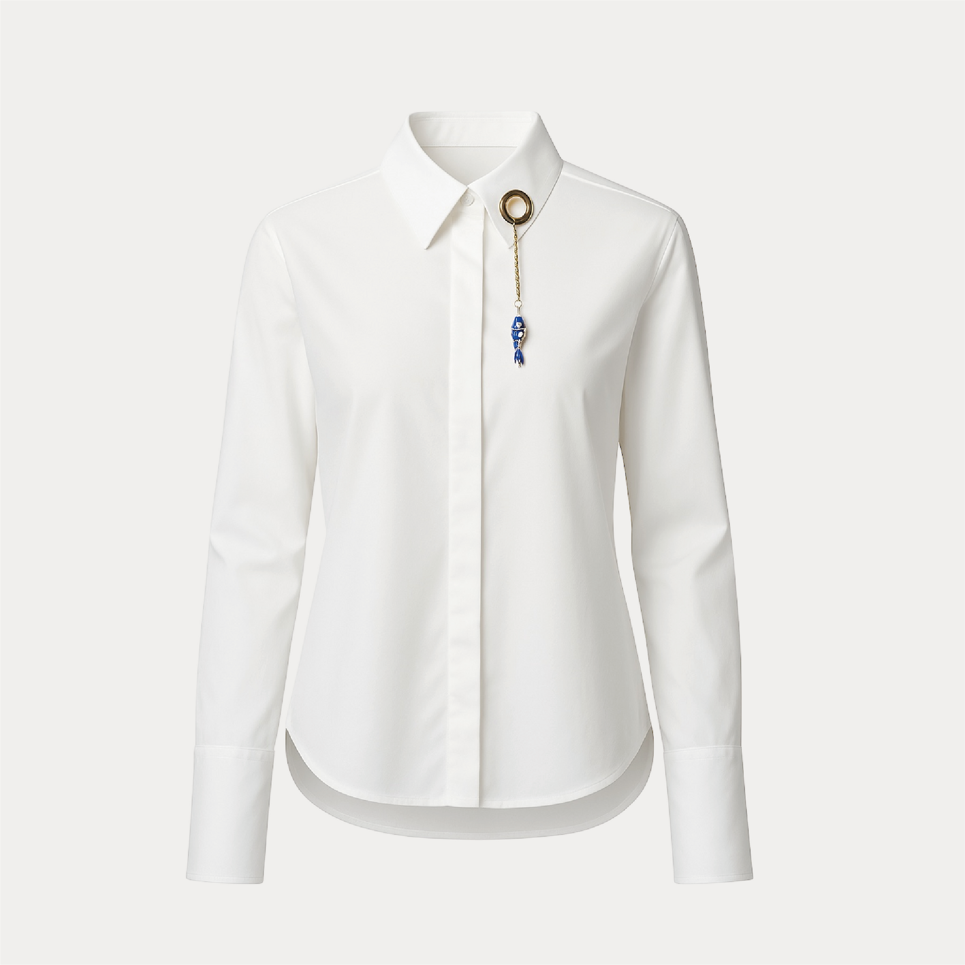 La White Hook reinterpreta el clásico en clave disruptiva: confeccionada en popelina de algodón, con silueta relajada, puños anchos y un detalle protagonista en el cuello —un ojal metálico oversize del que cuelga un charm de pez esmaltado en azul cobalto.
