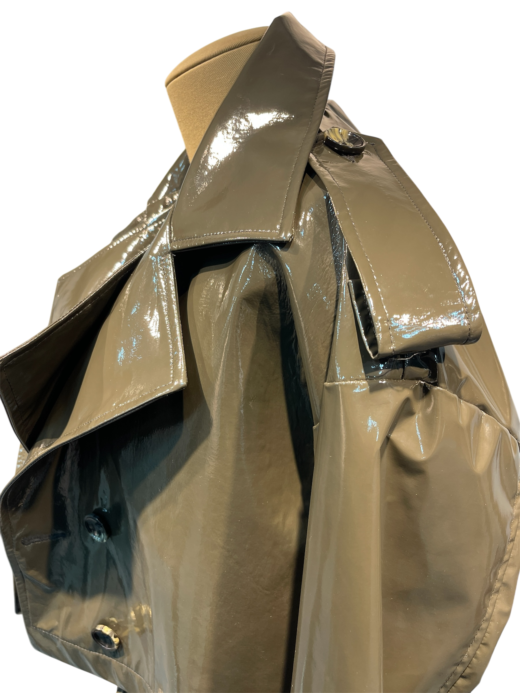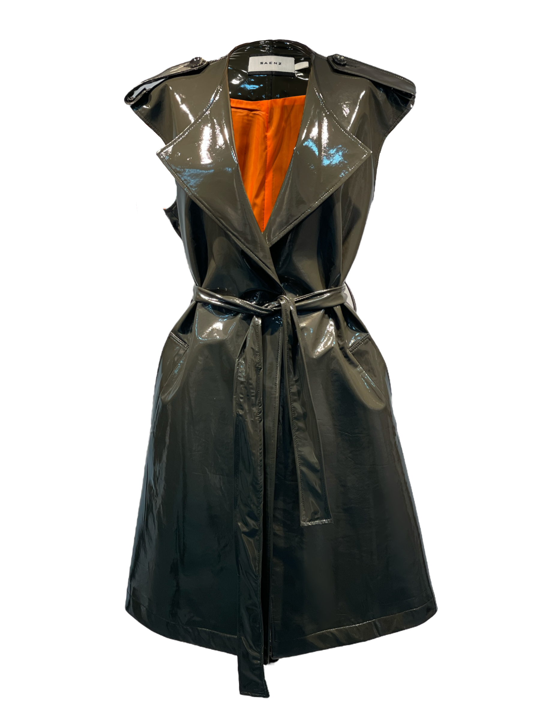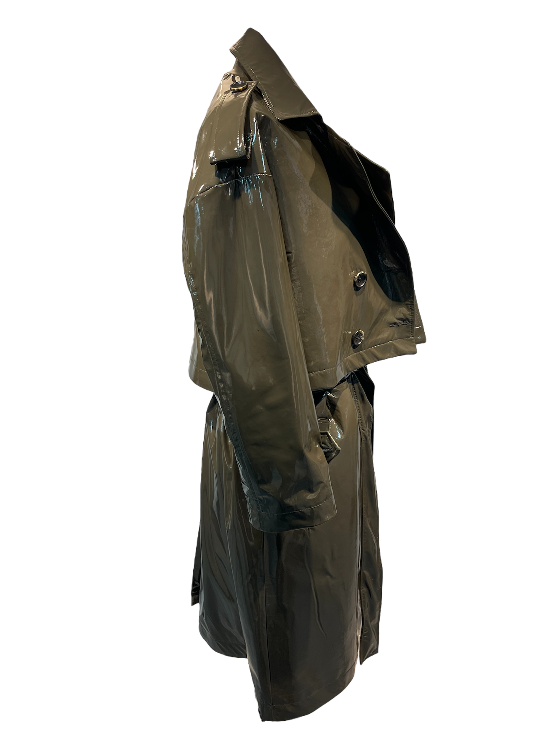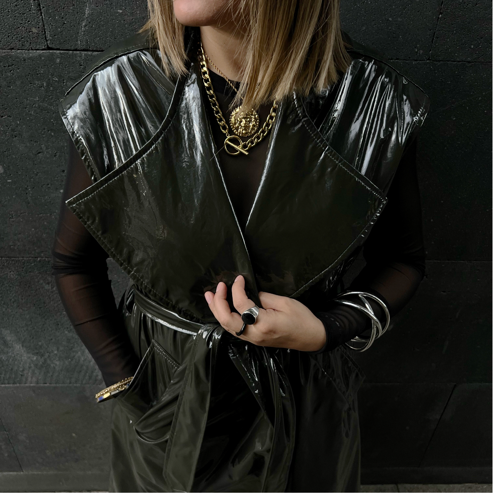 No es una gabardina cualquiera. Es una pieza de colección de dos partes: una chaqueta corta y un chaleco largo que puedes usar juntos o por separado. Su acabado glossy tipo vinilo transforma esta prenda en un statement que eleva cualquier outfit con un solo movimiento.